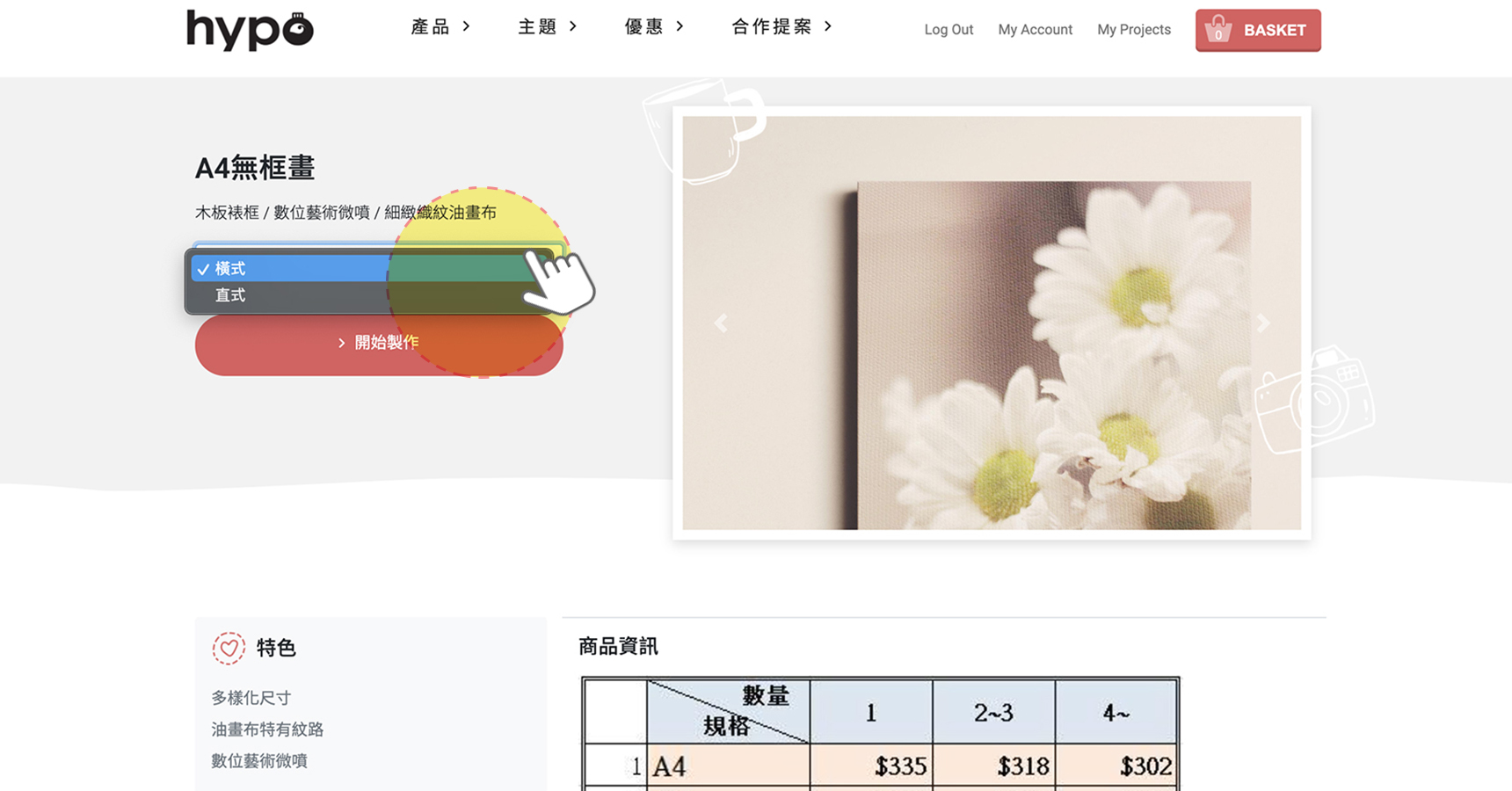 挑選好想製作的商品後,記得再選擇直式或橫式!接著按下 『開始製作』