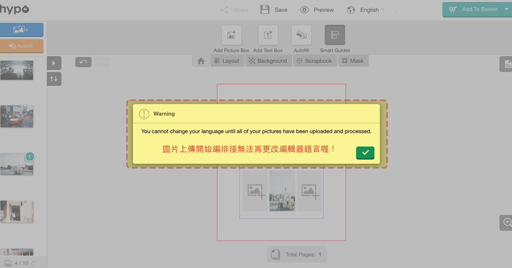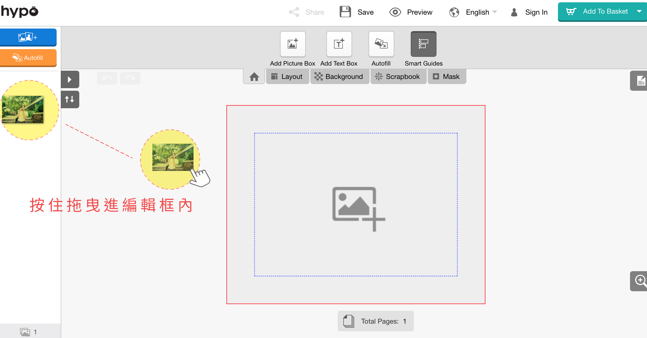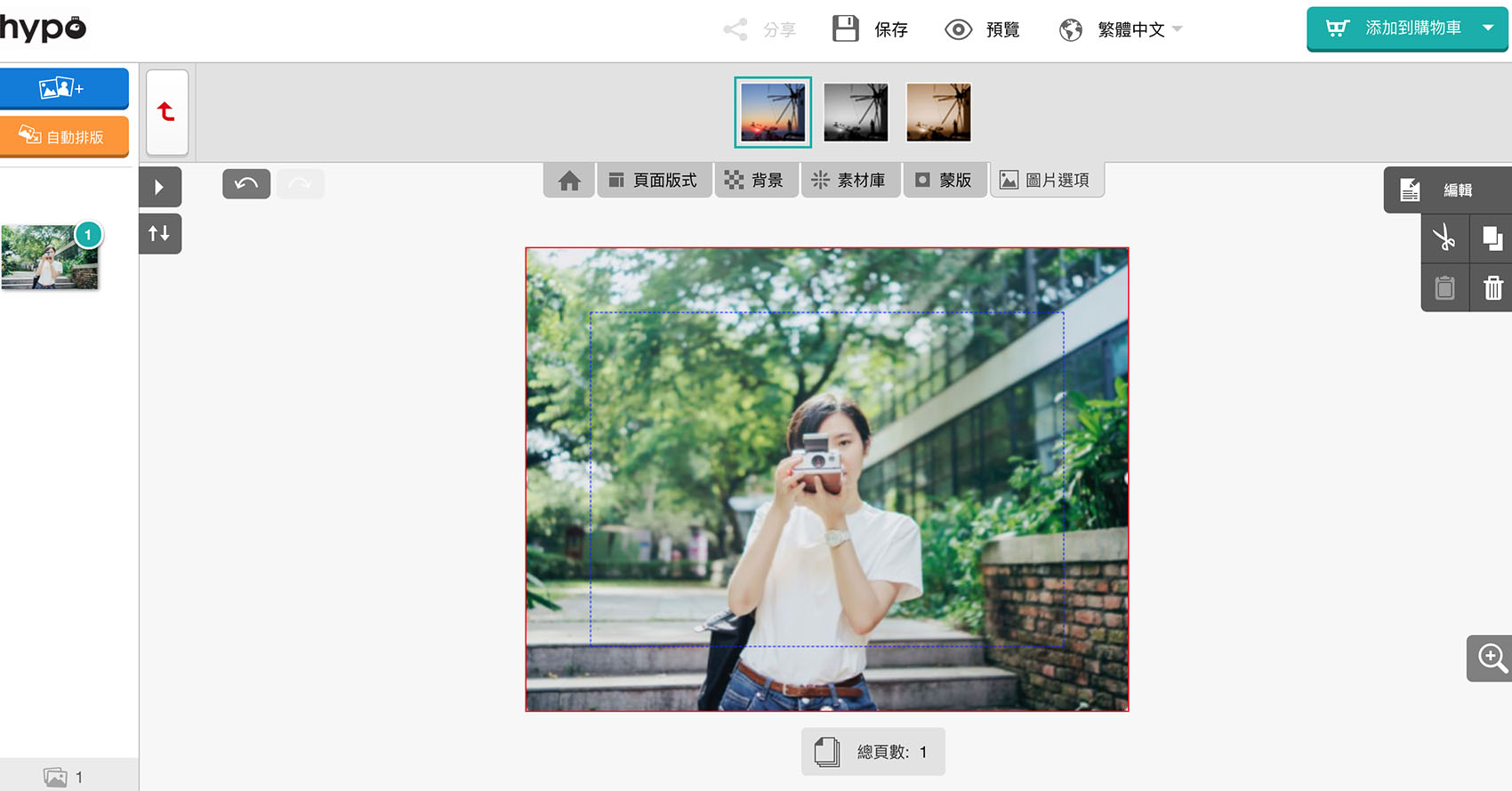 完成上傳的圖片會在左欄顯示縮圖,選擇您要編輯的圖片,按著滑鼠拖曳進編輯區範圍就可以囉!