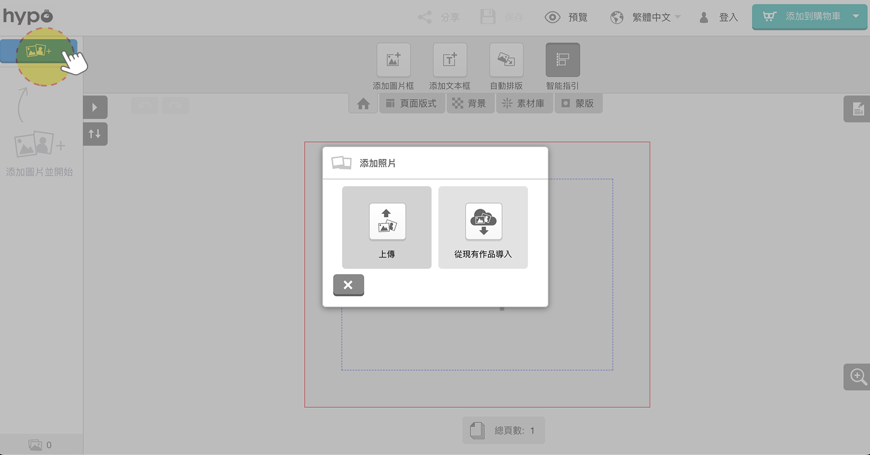 接著,來上傳圖片素材吧!按下左上角藍色的按鈕後,在跳出添加照片視窗中的點選『上傳』