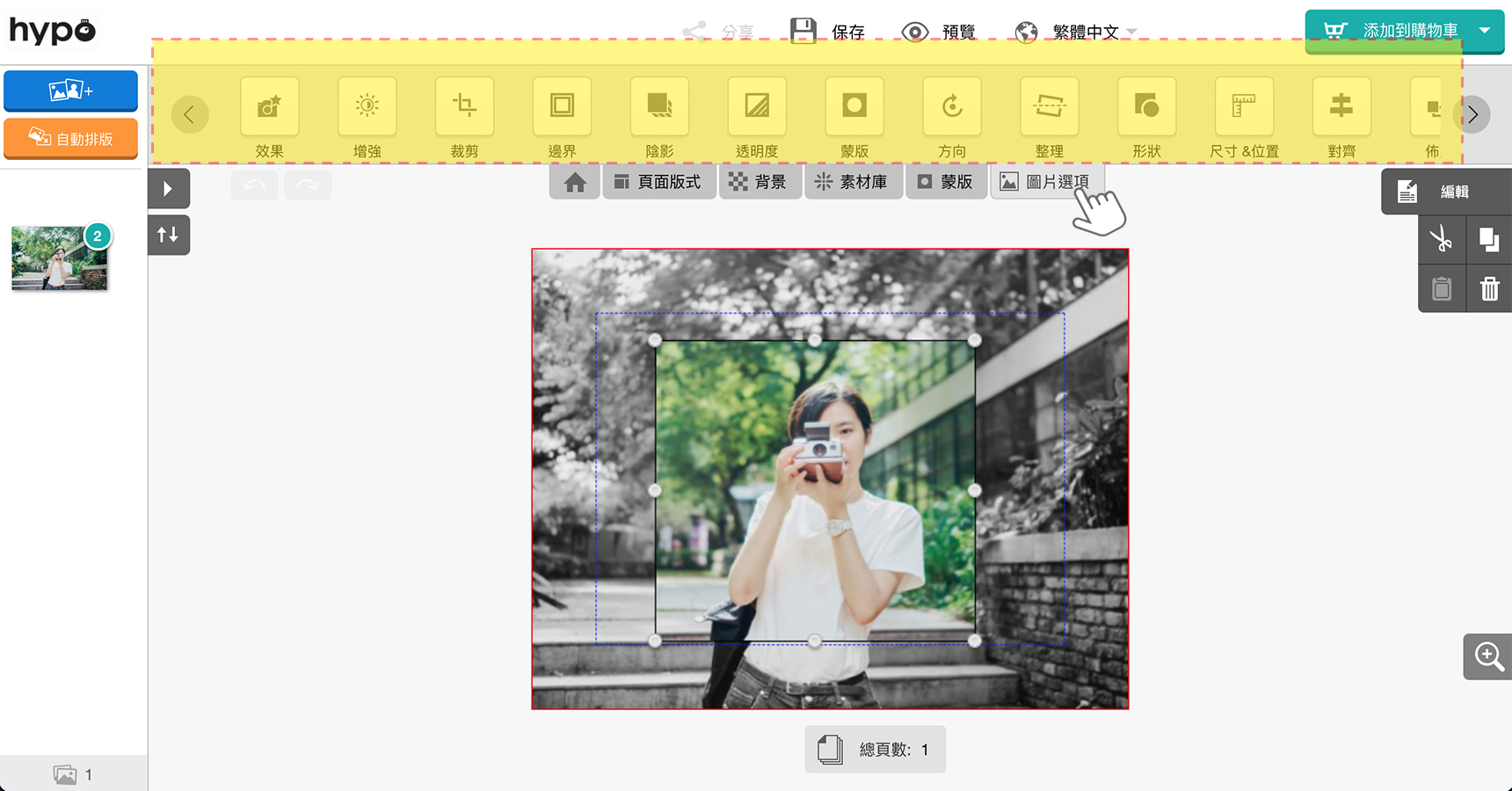 接著,您可以點選 『圖片選項』 編輯照片樣式!多樣化的工具可以讓您的作品更加豐富!若不清楚使用方式,可以到編輯工具說明頁查看