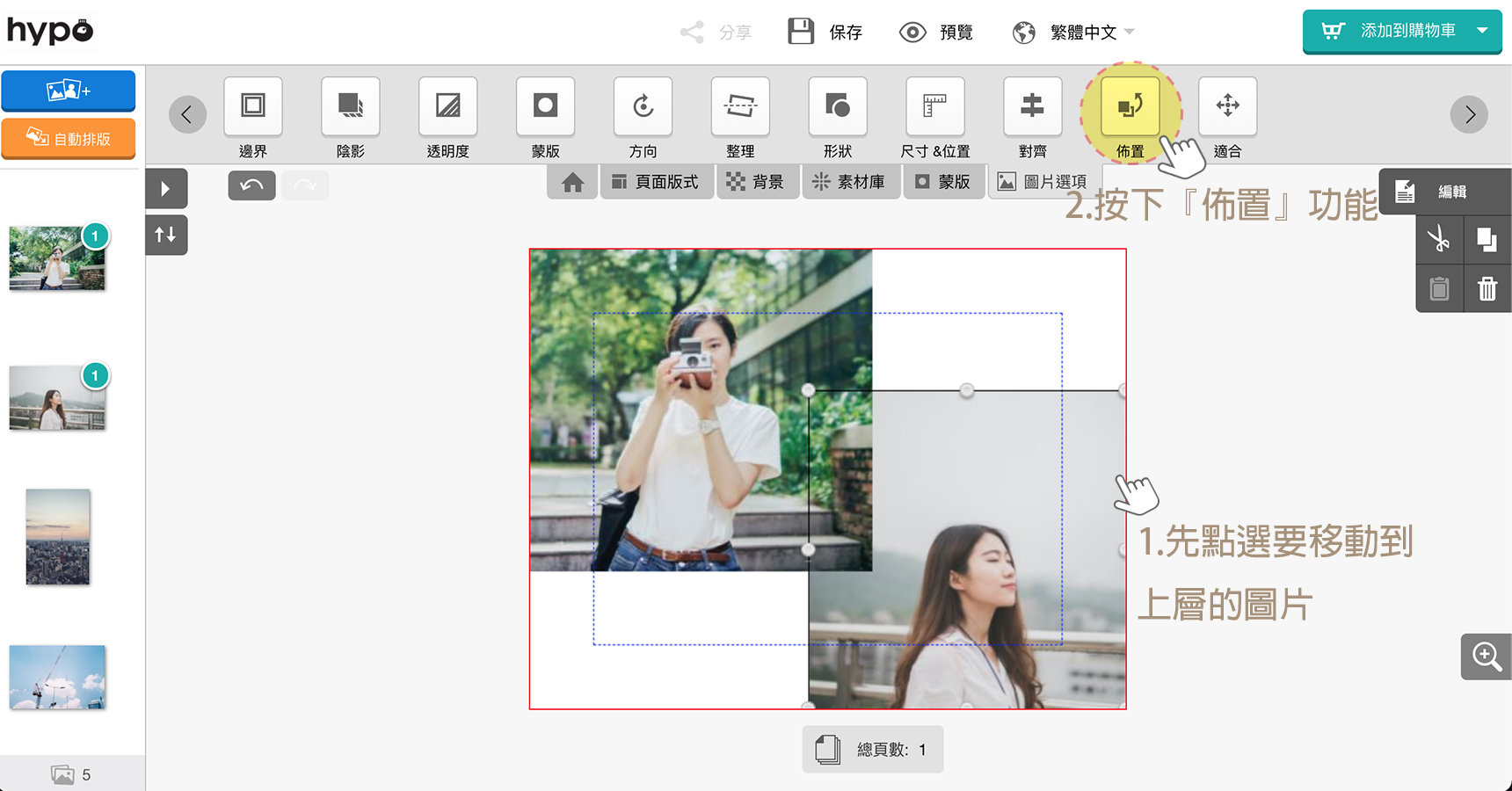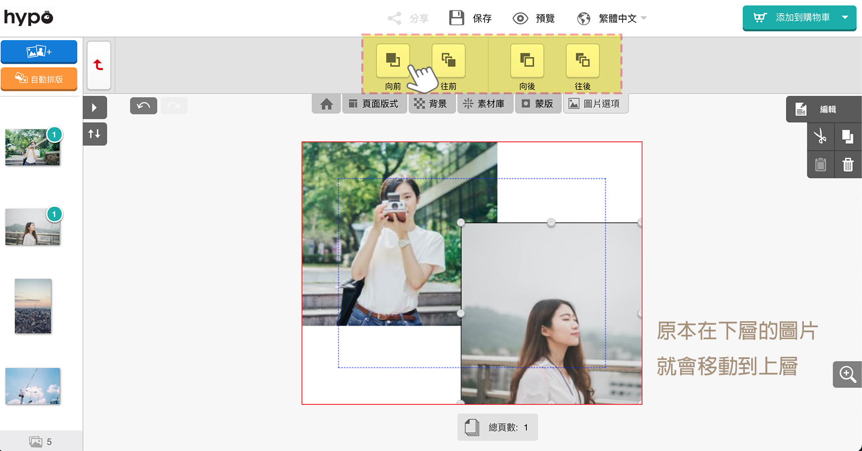 即為一般常見的圖層順序工具,當您有多張圖要同時呈現時可以編輯圖片的層級,讓作品更有層次感
